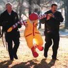 На испытаниях при первом же выстреле курица разбила особо прочное ветровое стекло скоростного экспресса, пробила приборную доску, сшибла кресло машиниста и влипла в заднюю стенку кабины.