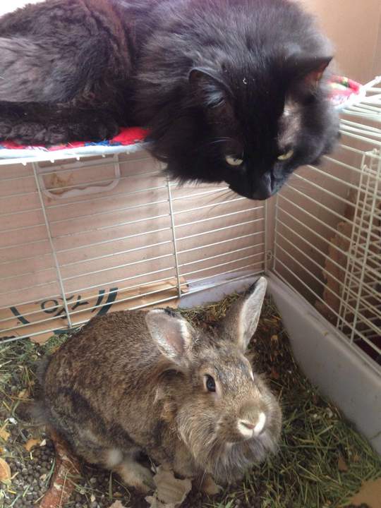 Близко познакомившись с кроликом, кот больше не рисковал. Хотя и хотел